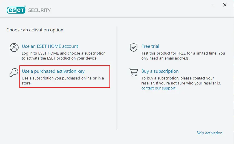 When choosing activation option, select Use a purchased activation key.