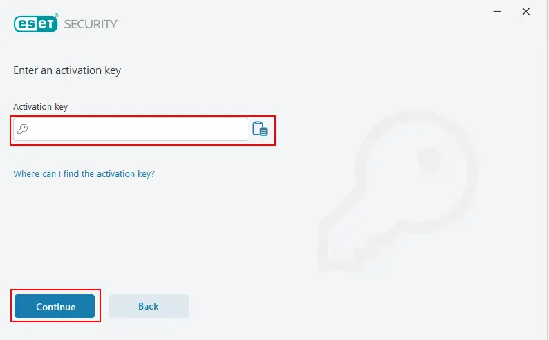 Type or copy/paste your ESET-issued activation key into the Activation key field and click Continue.